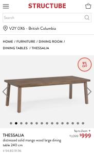 나무 다이닝 테이블 길이 200cm 테이블벤치 X 1 체어 X 4 세트로만 판매합니다. 1년 조금 넘게 사용했지만 상태 굉장히 좋습니다. 다른 식탁을 구매하게되어 팝니다. 픽업은 랭리 윌로비 이며 딜리버리는 불가능합니다. 현재 가구를 창고에 넣어놓아서 픽업은 3월 27일 혹은 그 이후 가능하십니다. 문자 부탁드립니다.
